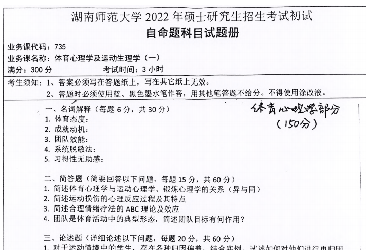 2008-2024年湖南师范大学735体育心理学及运动生理学(一)考研真题试卷