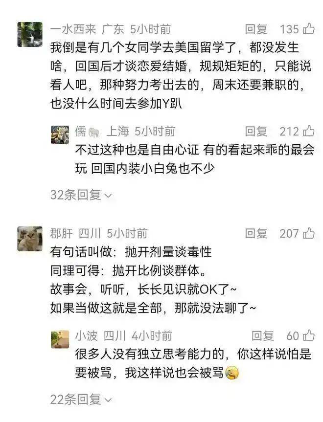“大家愤怒的,不是陪读妈妈有没有自由,而是 信息不透明带来的欺骗风险。”“很多‘留学生’或‘陪读家长’回国后,对海外经历闭口不谈或刻意美化,在求职、婚恋市场上制造了不公平。”“公司要求留学生提交额外体检证明和无犯罪记录,就是被这种潜在风险‘整怕了’。”