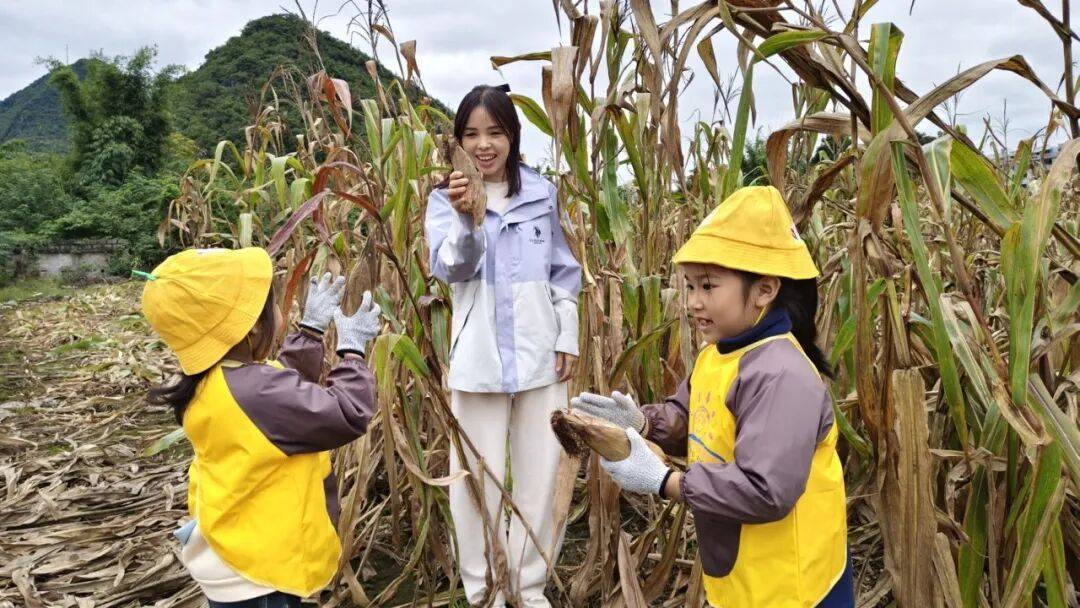 老师带领小朋友在农家玉米地进行研学活动