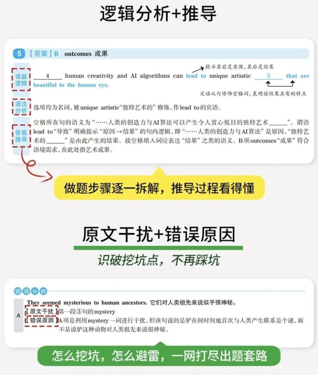 针对所有真题文章进行全文本拆解,点拨词汇用法,解析理解难点,并配备精准参考译文。