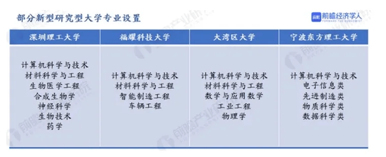 而在学科布局上,新型研究新大学专业设置基本在10个左右,专门聚焦战略性新兴领域和关键核心技术,并且与所在城市产业结构布局紧密关联。