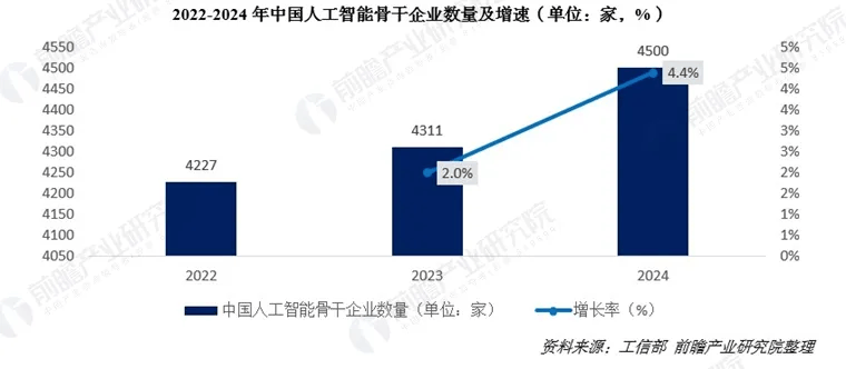 从数据来看,近几年AI行业参与者数量快速增长,2022年中国AI骨干企业数量为4227家,2023年达到4311家,同比上涨2%左右;2024年中国AI行业骨干企业数量约4500家,同比上涨4.4%。