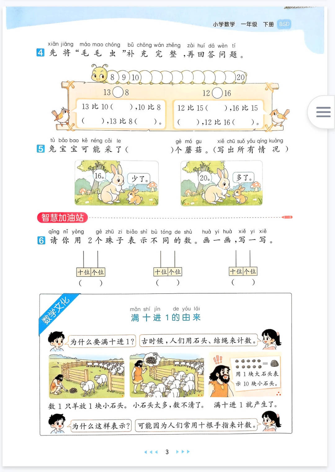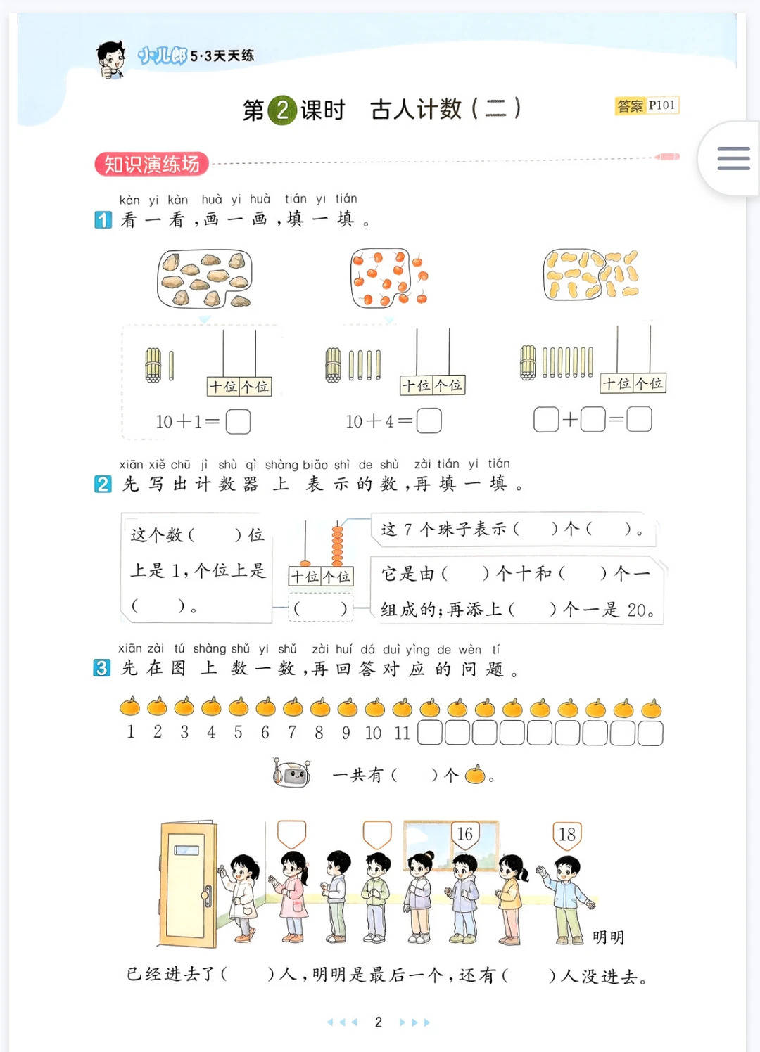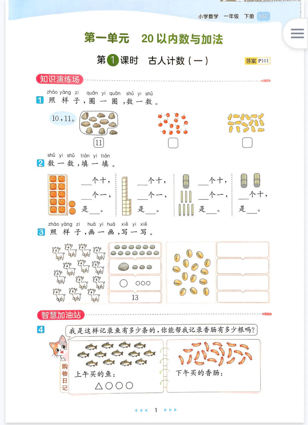 用 “趣味情境 + 分层任务” 把知识点深度结合,比如 “古人计数” 单元通过石头、结绳的故事,让孩子在趣味中理解 “满十进一” 的计数原理;“搭积木” 通过直观的图形拼搭,强化 20 以内加减法的应用;“图形大变身” 通过影子剧场、找图形等游戏,培养空间认知能力,既贴合 “一年级重趣味与基础” 的特点,又填补了 “只会算不会用” 的漏洞。