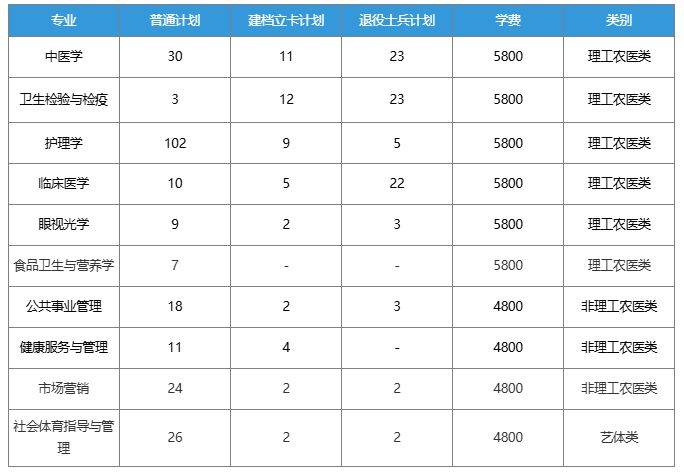 招生专业共10个:护理学 (116 人)、临床医学 (37 人)、中医学 (43 人)、眼视光学 (14 人)、卫生检验与检疫 (21 人)、食品卫生与营养学 (7 人)、公共事业管理 (23 人)、健康服务与管理 (15 人)、市场营销 (28 人)、社会体育指导与管理 (30 人)。其中【护理学】招生人数最多:共计116人,具体招生情况如下: