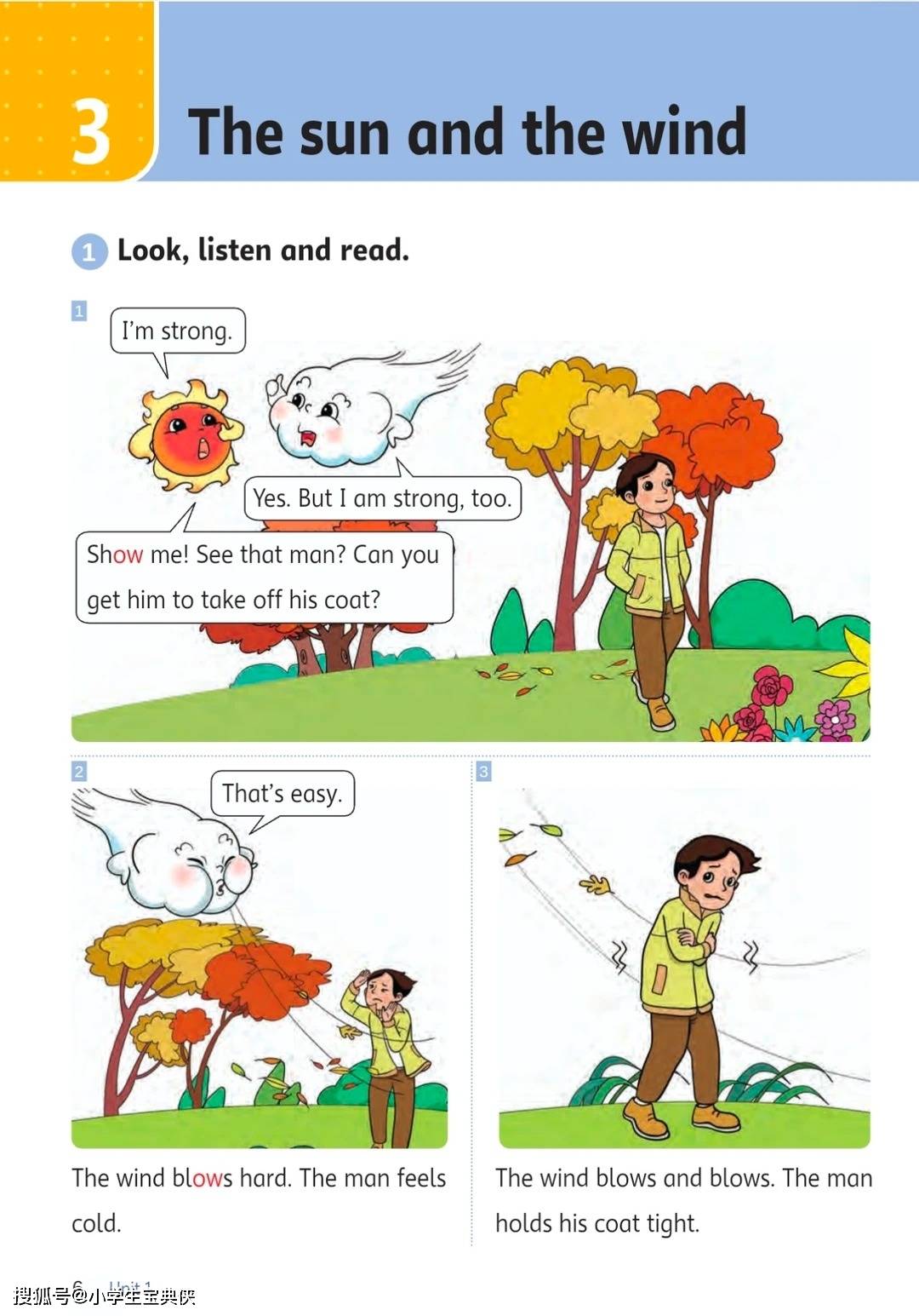 • 寓言故事渗透:“The sun and the wind” 通过太阳与风的寓言故事,在提升阅读能力的同时,传递温和比强势更有效的生活哲理。