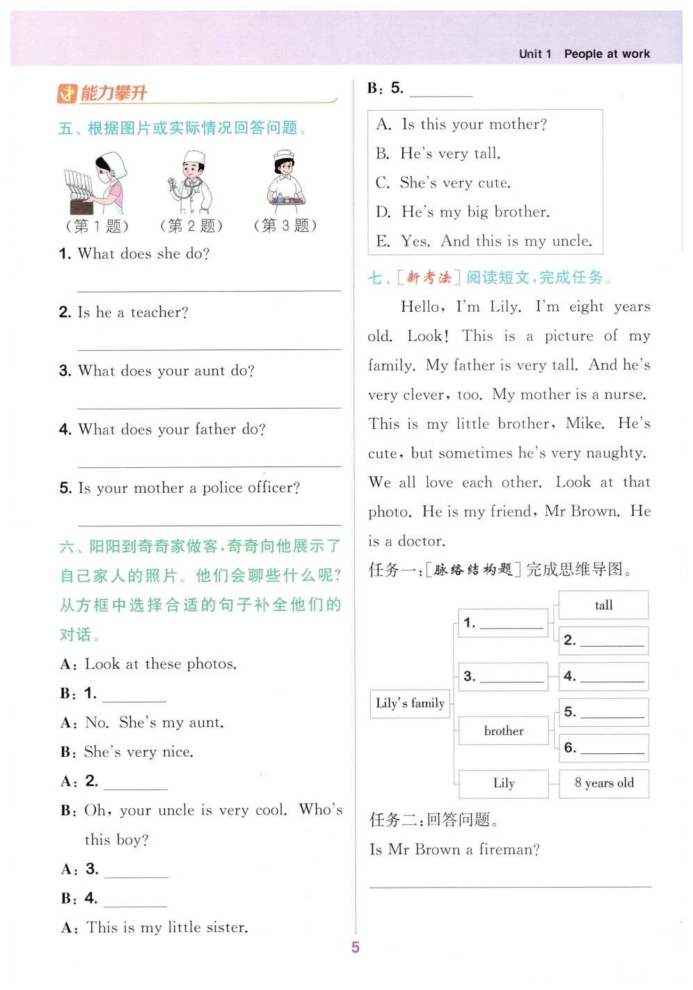 - 拓展层:通过 “短文阅读、表格填写” 提升综合能力,比如 “Lucy 的家人职业” 的阅读理解;