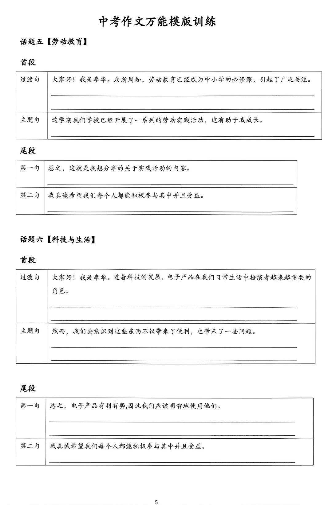 这份中考英语作文万能模板训练资料,直接把初中英语常考的八大核心话题打包成 **“首尾段模板 + 中间段框架 + 中英对照 + 实战演练” 的全能提分包 **:从 “学习策略、传统文化” 到 “人际交往、介绍家乡”,再到 “劳动教育、科技与生活”,连 “通用句式、高分搭配、写作框架” 都安排得明明白白,还配了实战演练和中英对照,简直是中考英语作文冲刺满分的 “神器”!