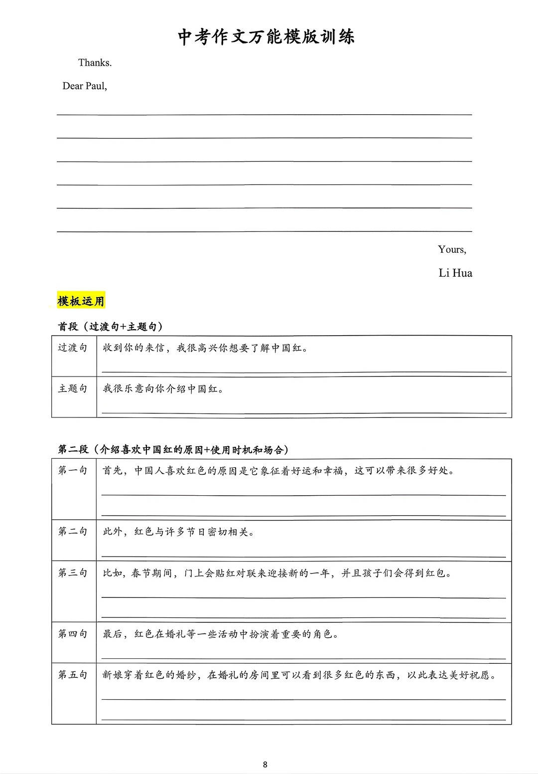 - 应试提分:“万能模板、高分句式、话题框架” 是中考英语作文的提分关键,比如 “首尾段固定句式、中间段分点论述”,提前练熟了直接提升作文档次;