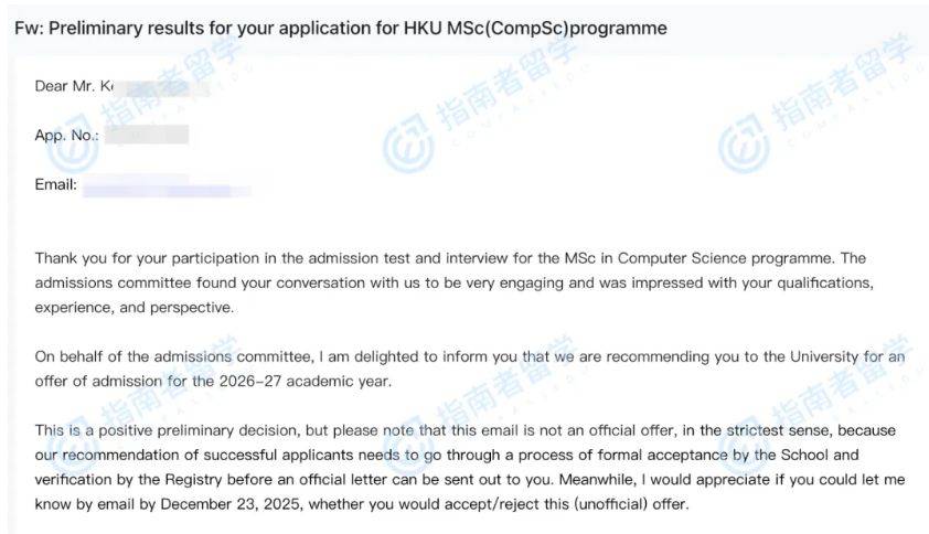 紧接着,爱丁堡的 offer 也顺利到手,有了这两份保底 offer,我得以毫无顾忌地冲刺梦校。12 月 19 日,我迎来了申请季的高光时刻 —— 收到港大计算机科学(金融计算方向)的推研邮件,招生委员会特意提及对我的资历和视角印象深刻,这不仅是一份录取认可,更是对我转型量化 / CS 方向的最大肯定。