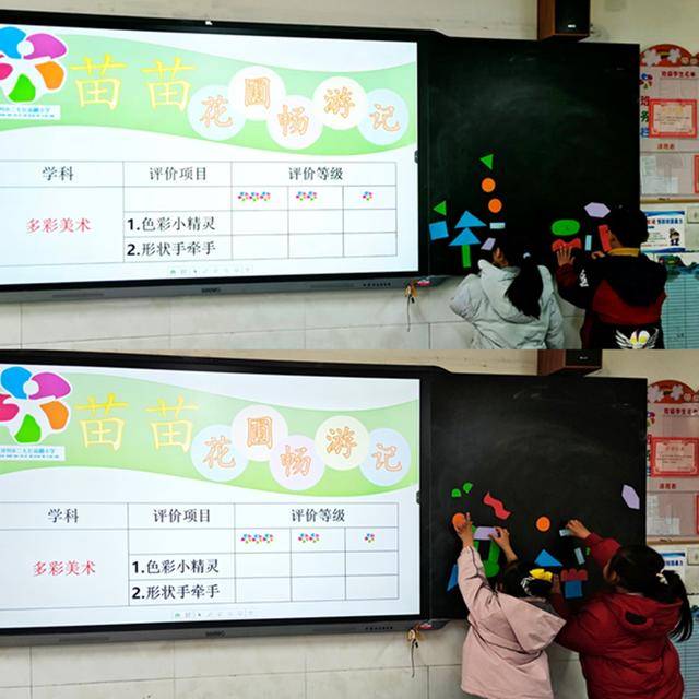 在美术闯关环节,一年级测评以“色彩小精灵”“形状手牵手”趣味环节为载体,孩子们玩转色彩、巧拼形状,在体验中展现创意与审美,让评价成为感受美术魅力、激发创作兴趣的快乐旅程。二年级多彩美术闯关,以“光荣奖章”为核心,学生自主设计制作奖章并现场展示,既要说明造型、色彩等设计思路,也要分享赠送对象与心意,同步考察美术创作能力与语言、情感表达能力。