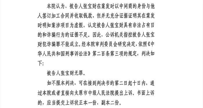 随后,山西太原市迎泽区法院对该案进行了新的审理。当年办案机关的侦查人员、已刑满释放的孙玉飞等先后参加庭审。孙玉飞在庭审中不认可项目虚假,不认可和张宝财合伙诈骗,承认确实有收取张宝财部分钱款。2026年1月14日,山西省太原市迎泽区人民法院发布关于该案的刑事判决书。法院认为,张宝财在案发时以中间商的身份与他人签订加工合同并收取钱款,但并无充分证据证明其在案发时明知案涉项目为虚假,认定张宝财具有非法占有目的和诈骗行为的证据不足。因此,公诉机关指控被告人张宝财犯诈骗罪不能成立,判决张宝财无罪。