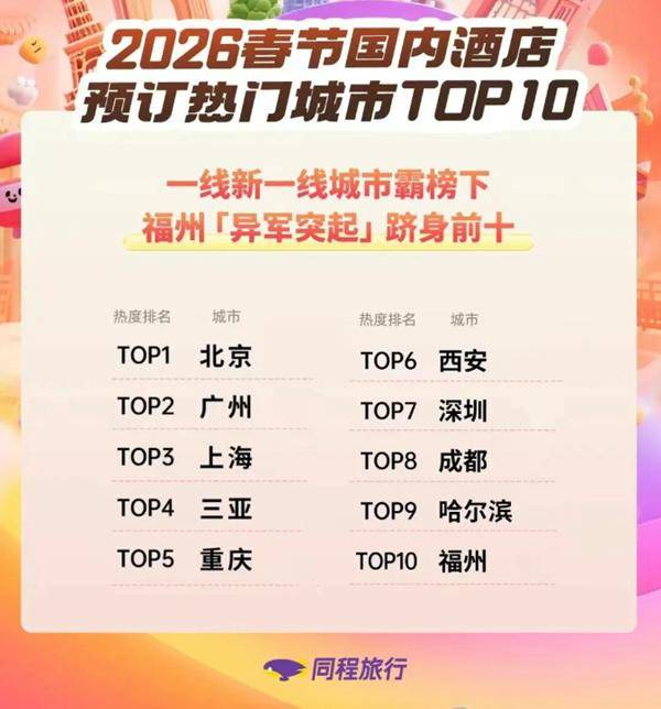 同程旅行数据显示,春节国内酒店预订热门城市TOP10榜单,基本被一线、新一线城市霸榜,但“国家历史文化名城”福建福州闯出一席之地,跻身第10名。2025年,三坊七巷、烟台山、上下杭等3个街区全年接待游客超5500万人次,创历史新高。