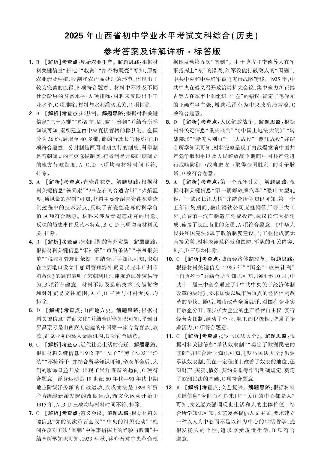2025年山西省初中学业水平考试中考历史解析