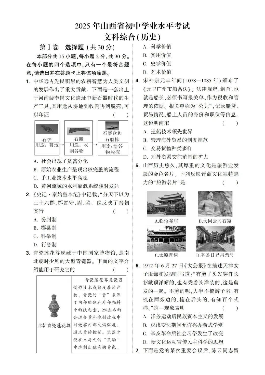 2025年山西省初中学业水平考试中考历史真题