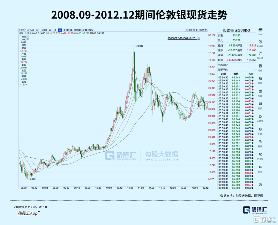 行情启动之初,白银从2008年底的8.5美元/盎司缓慢爬升,2010年下半年开始加速,11月突破20美元关口后彻底进入持续加速疯涨模式,至2011年4月29日,银价已飙升至49.83美元/盎司,创下1980年亨特兄弟操纵案后30年的历史峰值。