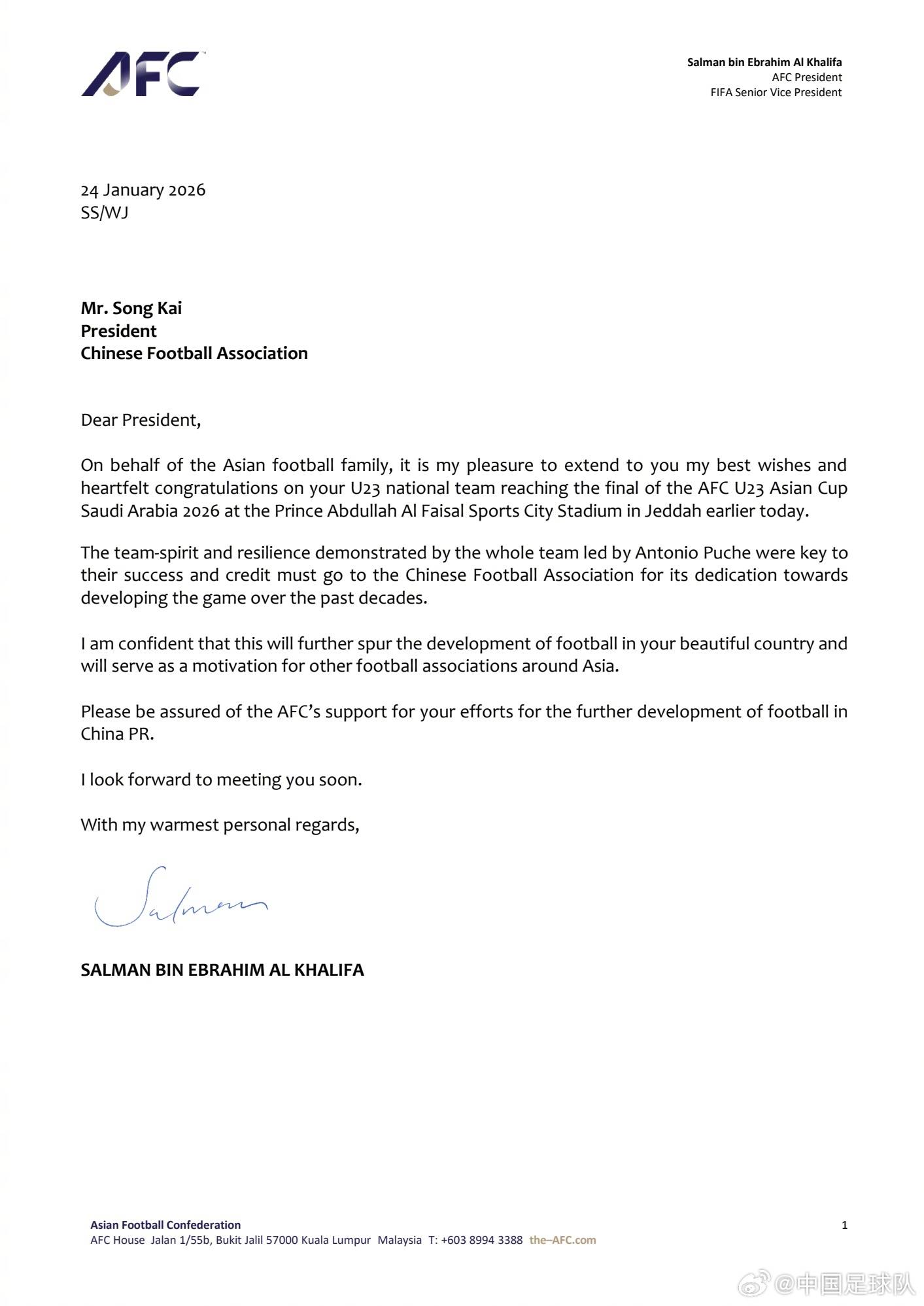 萨尔曼在来函中表示:“主教练安东尼奥率领的队伍在比赛中展现出了极强的团队精神与坚韧品格,正是队伍在本届赛事中取得优异成绩的关键所在。此项成就也应归功于中国足球协会过去数十年来为推动中国足球事业发展所付出的不懈努力。”同时,他确信中国队在U23亚洲杯上取得的突破将进一步助力中国足球事业的发展。