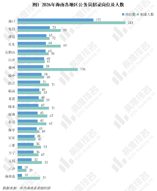 省直机关共设置48个岗位,计划招录59人。从各地市招录规模来看,海口市作为省会,计划招录243人,规模居全省首位;儋州市虽计划岗位数为58个,但招录人数达到136人,在招录人数上位列全省第二,大多岗位存在一岗多招的情况。
