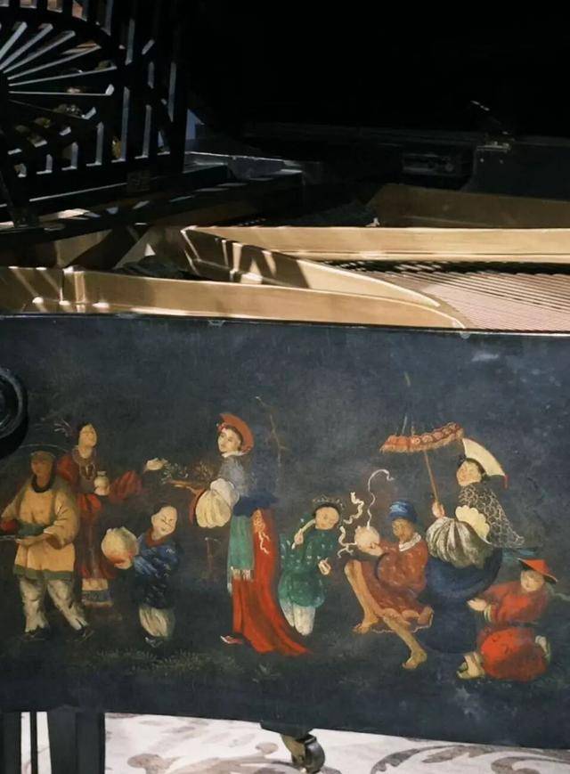 最令人惊叹的是一架中国风涂漆的博斯纳三角钢琴。这架钢琴大约于1915年在德国制造,黑色的外壳上绘制了中国古代的居民生活百态、盆景、楼阁等场景,描金花边。