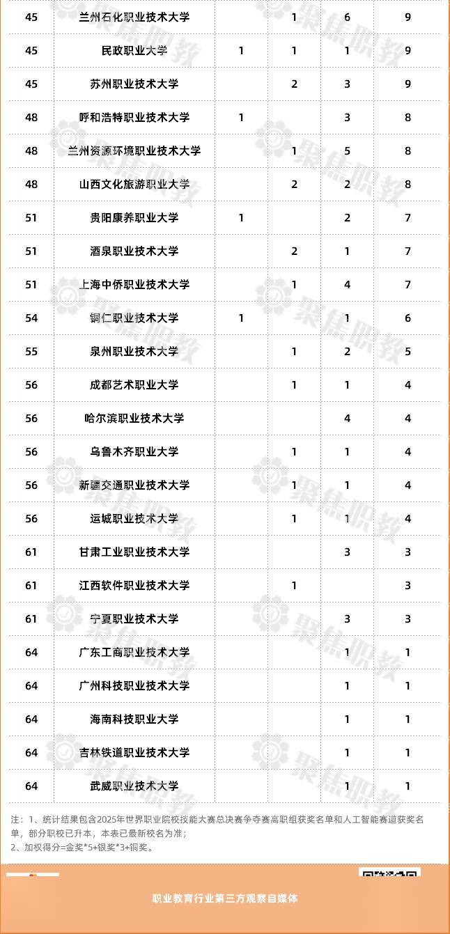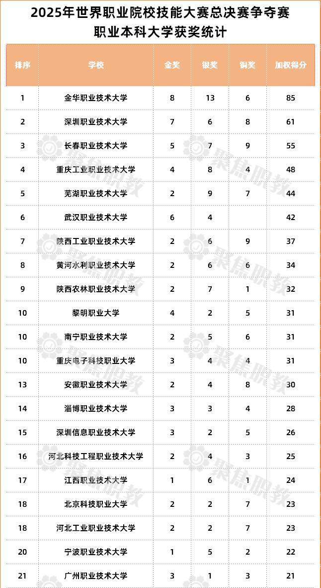 按照上述赋分标准,金华职业技术大学以8项金奖、13项银奖、6项铜奖,加权得分85分高居榜首;深圳职业技术大学以加权得分61分排名第二;长春职业技术大学以加权得分55分排名第三位。
