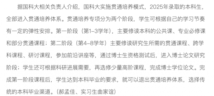 2025年,中国科学院大学录取的本科生全部进入贯通培养体系。贯通培养分为两个阶段,学生可根据自己的学习节奏有一定的弹性安排。