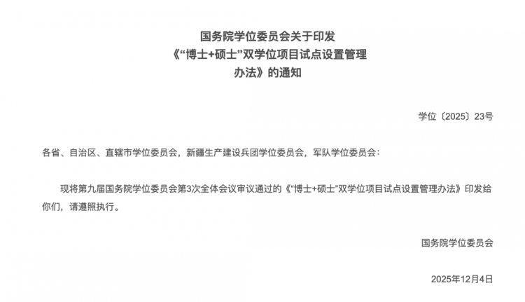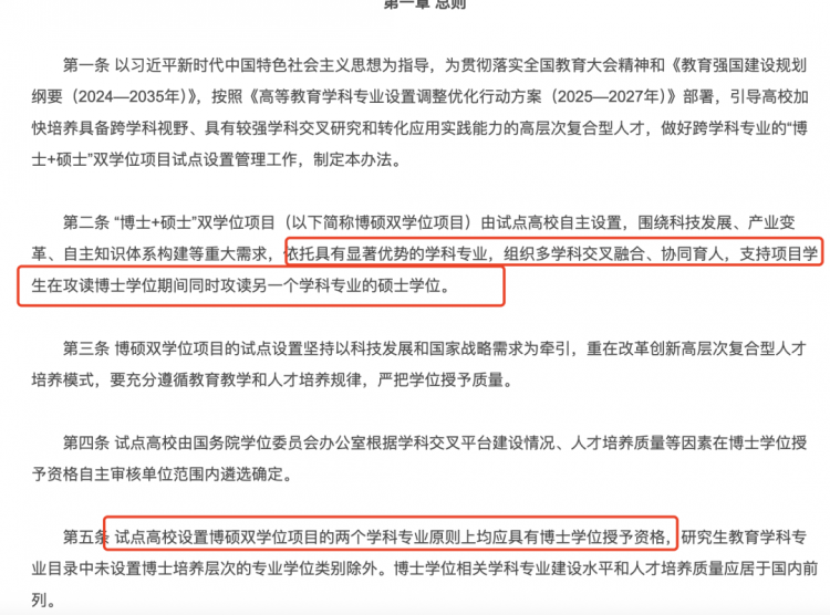 就以国务院前段时间发布的《“博士+硕士”双学位项目试点设置管理办法》来看——