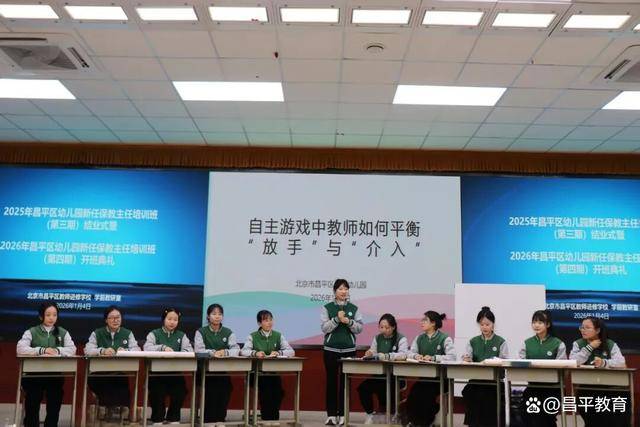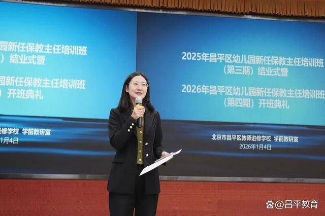 为着力培养区域内深植教育家精神、精通科学保教的高素质学前教育管理队伍,推动昌平区学前教育高质量发展,稳步实现“幼有优育”目标,区学前教研室持续扩大新任保教主任培养的覆盖范围,经过为期一年的系统学习与岗位实践,第三期幼儿园新任保教主任培训班于1月4日迎来结业典礼,并同步启动了第四期培训。区教委副主任王婷婷、教师进修学校副校长陈静、学前教研室全体教研员、保教班第三期、四期学员及其所在的园所领导共计100余人共同参与。