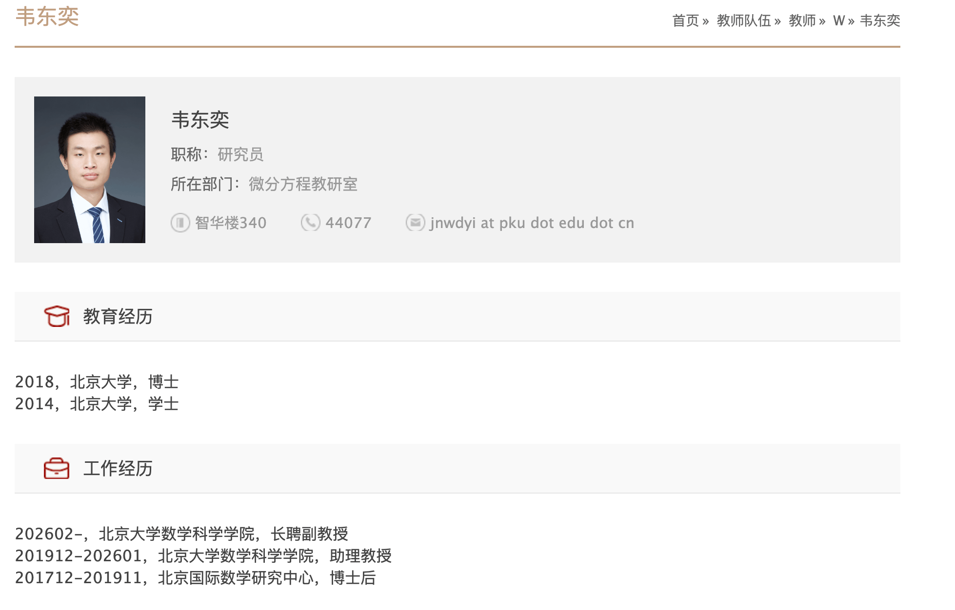 多知2月3日消息,北京大学数学科学学院网站教师信息更新显示,韦东奕正式获聘北京大学数学科学学院长聘副教授