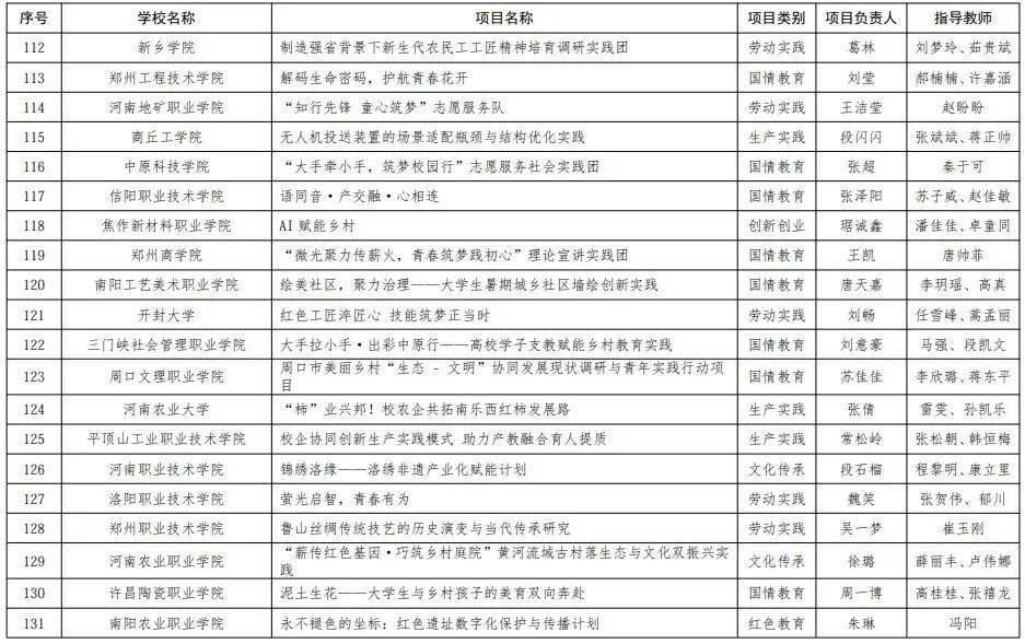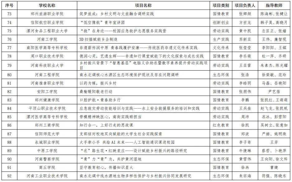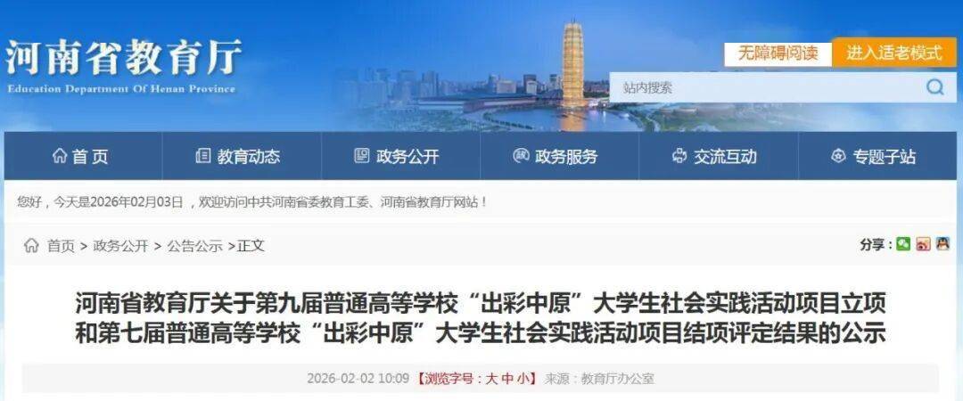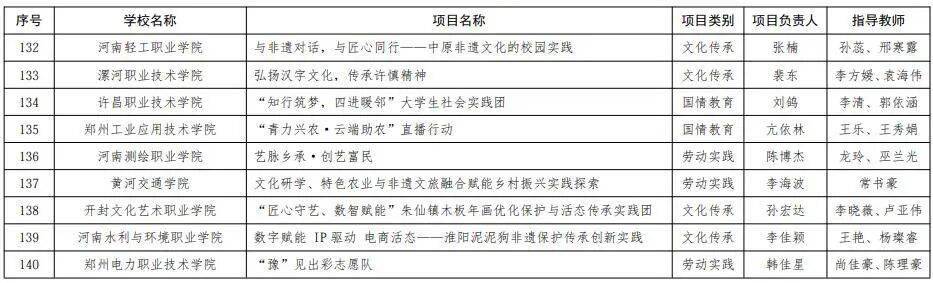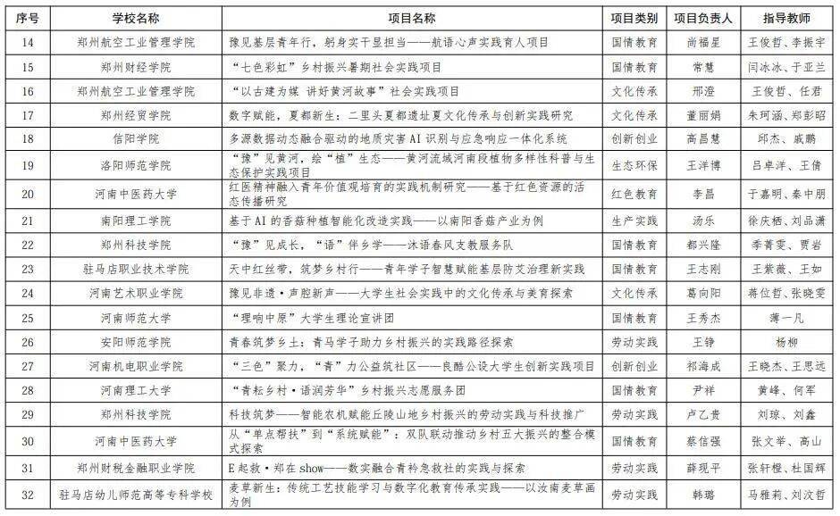 根据《河南省教育厅关于组织开展第九届普通高等学校“出彩中原”大学生社会实践活动的通知》(教学〔2025〕130号)和《河南省教育厅办公室关于做好第七届普通高等学校“出彩中原”大学生社会实践活动项目结项工作的通知》(教办学〔2025〕274号)要求,经各高校推荐,省教育厅组织专家评审,按照分类评审原则,确定140个第九届普通高等学校“出彩中原”大学生社会实践活动立项项目;80个第七届普通高等学校“出彩中原”大学生社会实践活动结项项目,并评定出一等奖10项、二等奖20项、三等奖28项;23个第七届普通高等学校“出彩中原”大学生社会实践活动项目延期结项。现将结果予以公示。