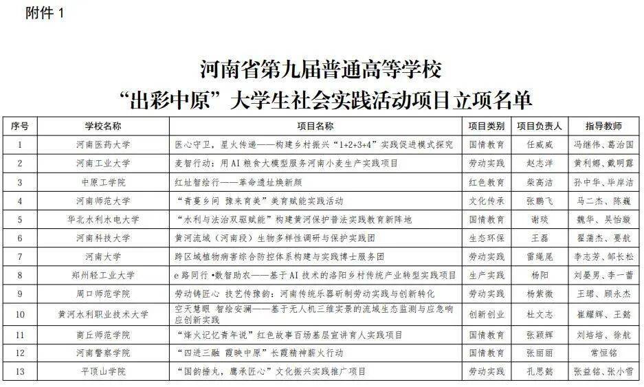 附件:1.河南省第九届普通高等学校“出彩中原”大学生社会实践活动项目立项名单