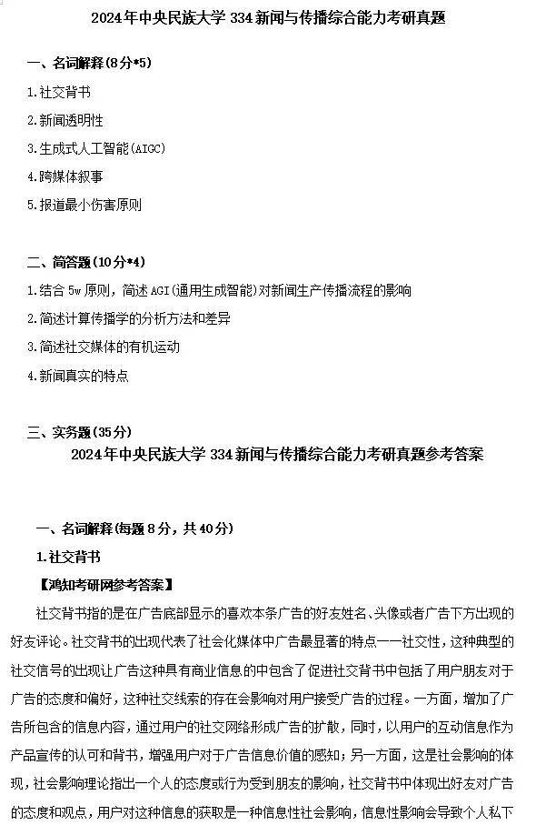 2024年中央民族大学334新闻与传播综合能力考研真题试卷与参考答案