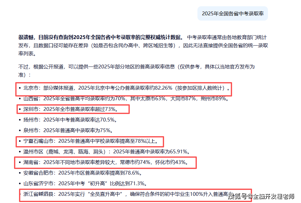 随后,我问了某AI工具,2025年全国各省市中考的录取率,结果显示相当一部分地区的中考录取率已经超过了60%,部分地区甚至超过了70%。