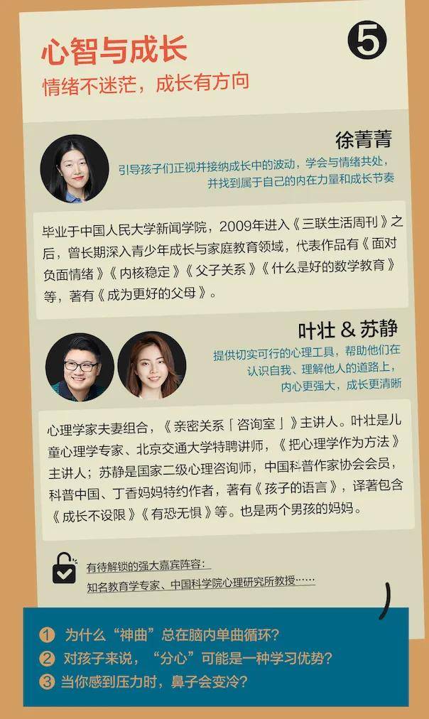 “心智与成长”板块,关注的是每个少年内在世界的波澜与秩序。我们相信, 认识自我与理解他人,是成长中最核心的课题。这一部分的 常驻嘉宾之一是《三联生活周刊》资深主笔徐菁菁,她长期关注 国际新闻与医疗健康领域;同时还有 心理学家夫妻组合叶壮与苏静, 他们都是 专业的心理咨询师,将从专业视角与生活经验出发,陪伴孩子 走过情绪起伏与认知发展的关键阶段。