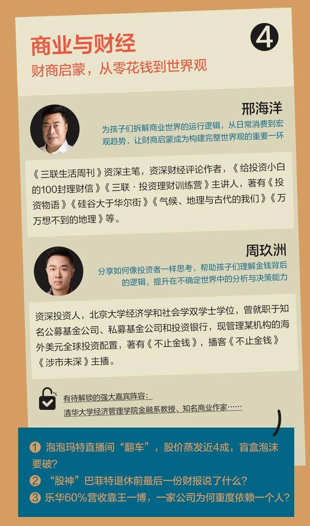 “财经与商业”板块,将从孩子熟悉的 日常消费与 职业现象入手,逐步展开对 经济逻辑与社会结构的认知。我们注重培养理性的财富观念与判断力,也希望 传递三联一贯的人文经济视角——经济不仅是数字,更是人的生活与选择。常驻嘉宾之一包括 《三联生活周刊》经济类资深主笔邢海洋。以及 资深投资人周玖洲,他将从经济学与社会学的双重视角解读商业世界的运行逻辑。