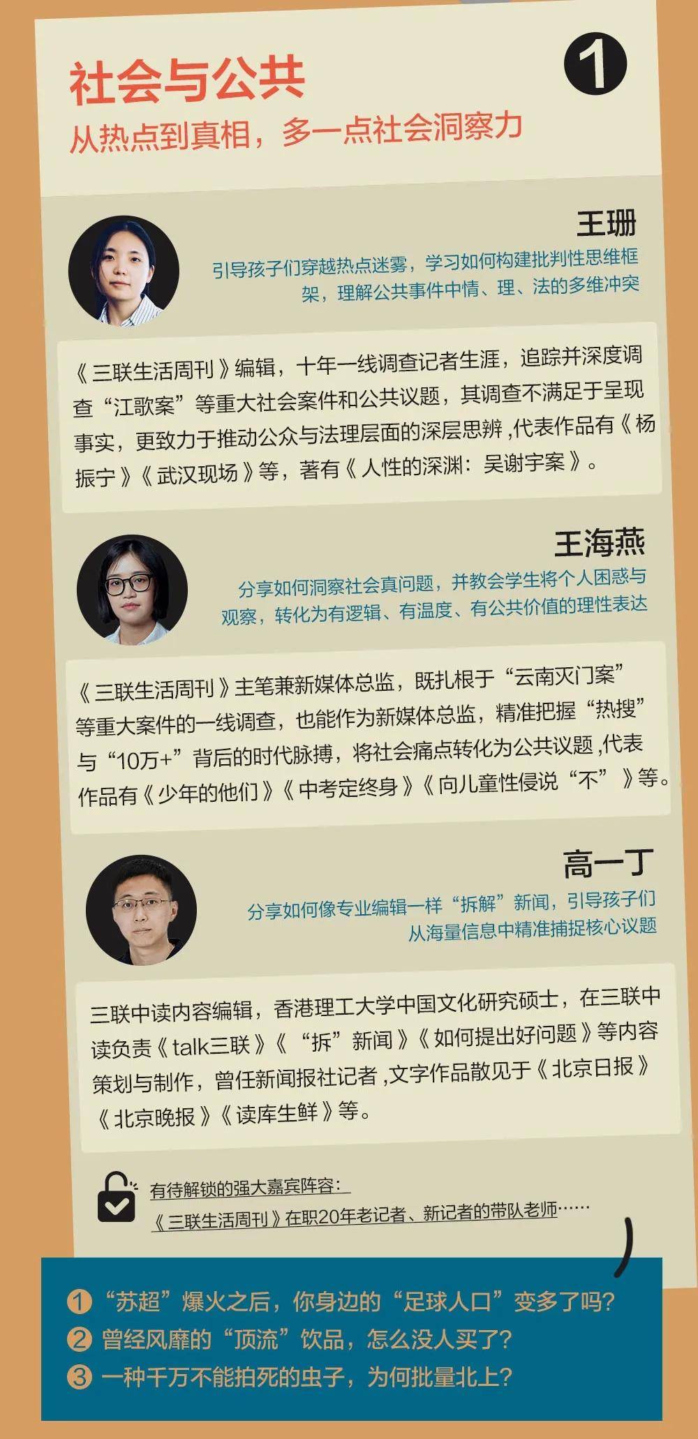 在“社会与公共”板块,我们将 围绕《三联生活周刊》多年来秉持的深度调查与人文关怀,选取与青少年成长息息相关的公共议题。从民生百态到制度运行,从伦理思辨到国际视野,我们希望通过真实的 人物故事与 社会现场,帮助年轻一代 建立起对公共生活的理解与责任感。这一板块的 常驻嘉宾之一是 《三联生活周刊》编辑王珊,她曾深入 报道“吴谢宇案”“江歌案”等引发广泛社会思考的案件;同时还有 新媒体总监王海燕,她常年身处新闻传播一线, 对“热搜”背后的社会心态与传播逻辑有着敏锐洞察。
