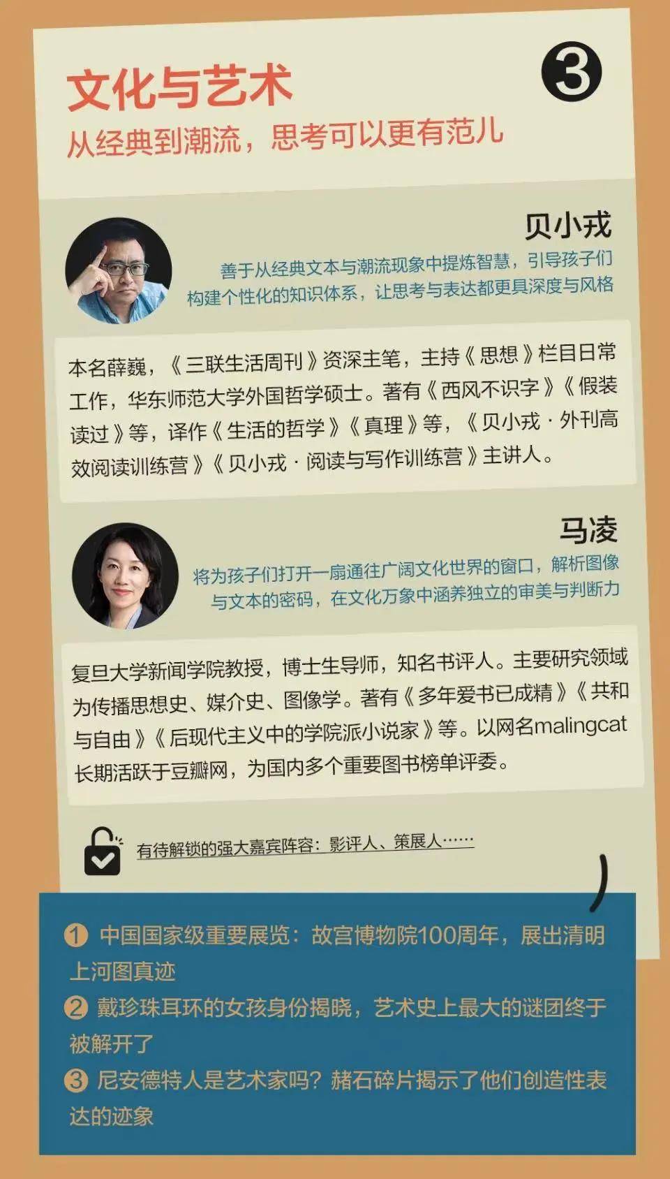 “文化与艺术”板块,是 三联人文底色的集中呈现。我们将不局限于经典或流行,而是通过 影视、展览、文学等多元载体,引导孩子在审美体验中发展独立思考与文化感知的能力。 常驻嘉宾之一有 资深主笔贝小戎,将从哲学与社会学角度切入,训练孩子拆解复杂文化现象; 复旦大学教授马凌则以她深厚的学养与鲜明的风格,带领大家读懂艺术与流行背后的时代情绪。
