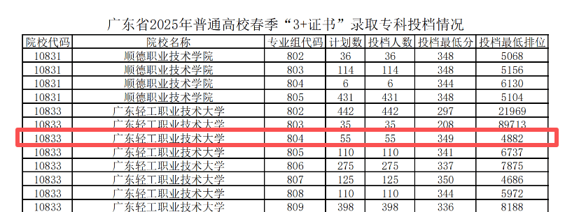 例如:广东轻工职业技术大学的3+证书804专业组。