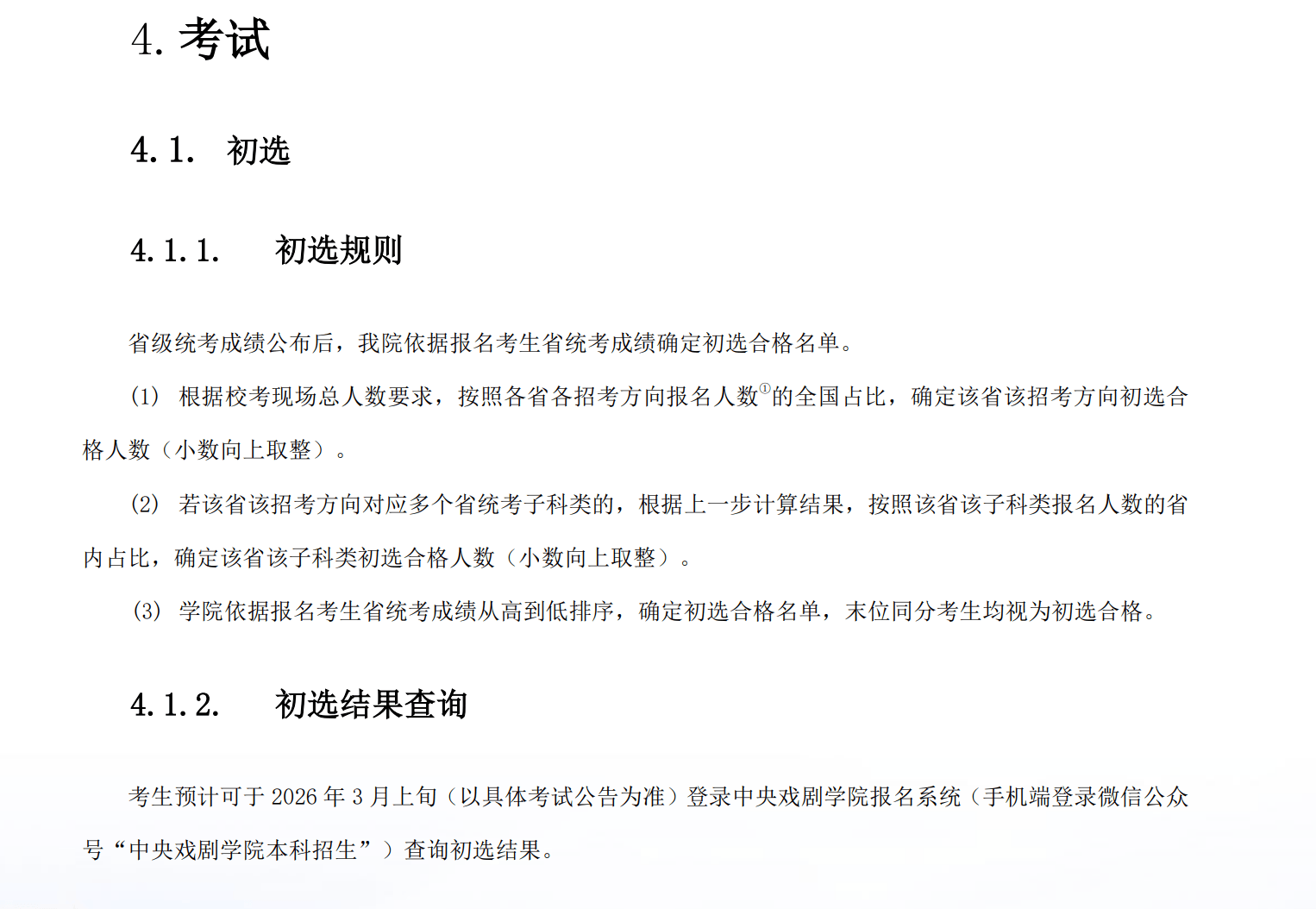 根据中戏发布的2026年本科招生专业考试简章,其中变化最大的是,今年将采用省级统考与校考相结合的方式进行生源选拔。省级统考成绩公布后,学校将依据报名考生的省统考成绩从高到低排序,确定初选合格名单。以表演(话剧影视表演)专业为例,该专业计划招生50人。按照教育部相关规定,组织校考的高校,现场校考人数原则上不超过招生计划数的6—8倍,合格证发放数量不超过计划数的4倍。这意味着该专业进入现场考试的人数仅为300至400人,拿证人数不超过200人。“全省统考排名前10名,进入现场考试的概率才比较大。”某艺考机构负责人冯程(化名)分析。