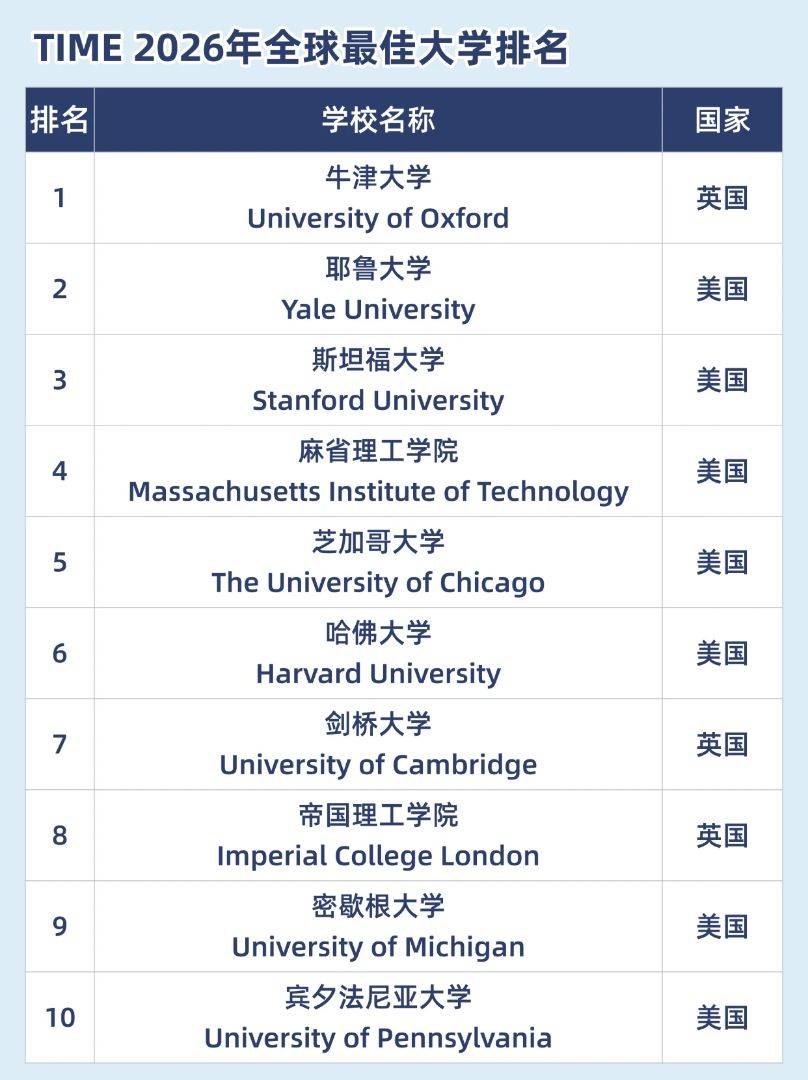 美国《时代周刊》(Time)也开始给世界大学排名了! 联手全球数据机构 Statista 推出的世界大学排名,与传统 QS、THE、ARWU 不同,它不只是看论文、学术声誉,而是重点评估大学能否培养出真正 未来领袖和改变者 ? ✨这次排名的核心指标主要包括: ✅ 校友影响力(毕业生是否在全球商业、科技、政界成为领军人物) ✅ 创新能力(专利数量、创业成果、科研转化) ✅ 全球社会影响(大学对经济与社会的真实贡献) ✅ 学术与教学基础(研究实力+国际声誉仍然占一定比例) 也就是说,这份榜单更像在回答一个问题:“哪所大学最可能真正改变你的未来” ?榜单前排依旧是牛津、哈佛等传统顶尖名校。大学竞争的本质,早就不只是排名数字,而是资源、平台和成长路径的综合较量。 如果你正在纠结选校,或者想判断自己适合冲哪类大学,其实比起单纯看榜单,更重要的是找到匹配自己背景的申请策略。