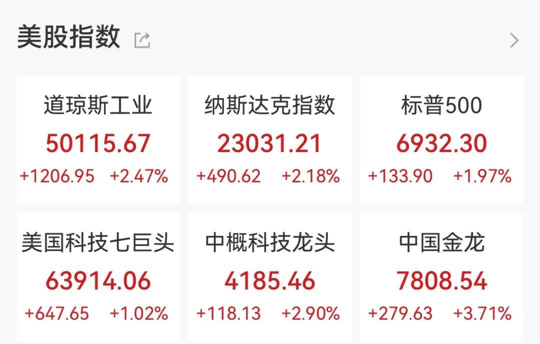 美东时间2月6日,美股三大指数集体收涨,道指涨2.47%站上50000点创历史新高,纳指涨2.18%,标普500指数涨1.97%。