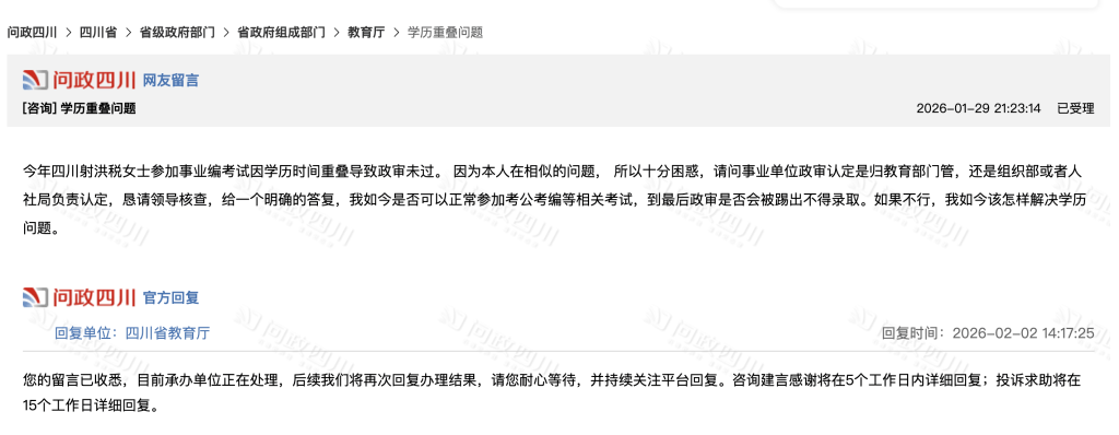 1月29日22时许,一名网友在“问政四川”平台,以《学历重叠是历史问题,还是违规操作》为标题,向四川省教育厅求助称:“因关注到‘四川射洪事业编拟录用第一名因学历重叠被判定资格不合格’的新闻,内心倍感忧虑。由于本人学历提升历程中,也存在中专衔接成人大专阶段的学习时段交叉问题,且正计划参与考公考编,因此对该类学历问题的认定标准及潜在影响高度关切。”