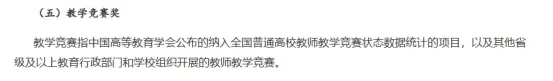 教学竞赛指中国高等教育学会公布的纳入全国普通高校教师教学竞赛状态数据统计的项目,以及其他省级及以上教育行政部门和学校组织开展的教师教学竞赛。