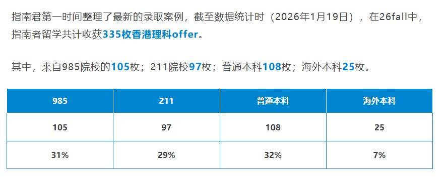 26fall 香港理科硕士申请竞争白热化,录取门槛持续攀升,而一组最新录取数据引发热议:截至 2026 年 1 月 19 日,指南者留学收获的 335 枚香港理科 offer 中,普通本科申请者斩获 108 枚,占比 32%,反超 985 院校(105 枚,31%)和 211 院校(97 枚,29%),海外本科则以 25 枚、7% 的占比位居末位。这一数据打破了 “名校背景定乾坤” 的固有认知,也让无数申请者困惑:港硕理科录取,究竟更看重本科背景,还是本科均分?