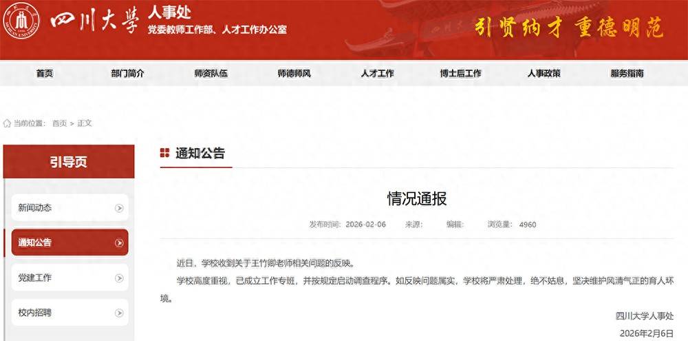 “学术研究的根基是诚信,师德师风的底线是敬畏。”2026年2月6日,四川大学一则通报引发全网关注,该校机械工程学院特聘研究员、博士生导师王竹卿,被课题组多名在读硕博生联名举报,涉及学术不端、经费侵占、师德失范及政治立场争议等多项严重问题。校方明确回应已成立工作专班启动全面调查,承诺若查实相关问题将严肃处理,绝不姑息,全力维护健康的育人环境与学术生态。