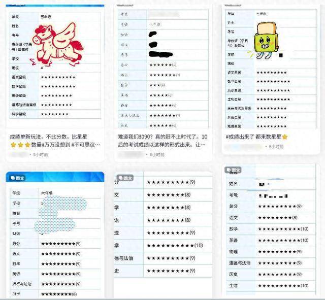 语文6颗星、数学2颗星、英语4颗星……近日,多位广东韶关的学生家长在网上晒出了孩子的期末考试成绩,不过成绩单上未显示具体分值,取而代之的是一排一排的星号。有家长笑称,这两天家长们都在数星星。