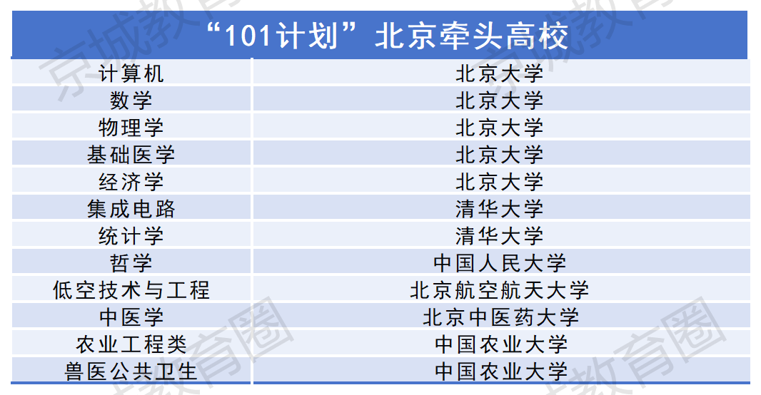 “101计划”不同的学科专业,对应不同的牵头大学。