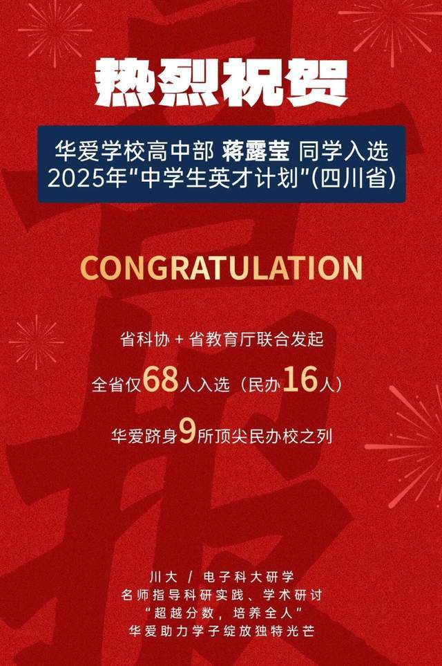 在国内外学术竞赛舞台上,华爱学子捷报频传:从AMC10/12国际数学竞赛全球前10% 到入选四川省“中学生英才计划”;从BBO生物奥赛全球金奖、SPBCN全国冠军、AMC8竞赛满分奖及全球卓越奖,到意大利卡斯特费达多国际手风琴比赛成人流行组冠军……每一项荣誉,都印证着华爱学子全面而卓越的成长潜力。