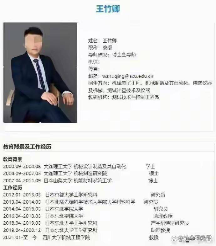 随着舆论热度不断攀升,王竹卿的个人履历以及高清生活照被网友逐一挖掘出来。从公开的履历信息可知,他有过海外留学与工作的经历,在四川大学担任博士生导师和特聘研究员,无论是学历背景还是工作头衔,都十分耀眼,在外人眼中,他无疑是一位杰出的青年学术人才。