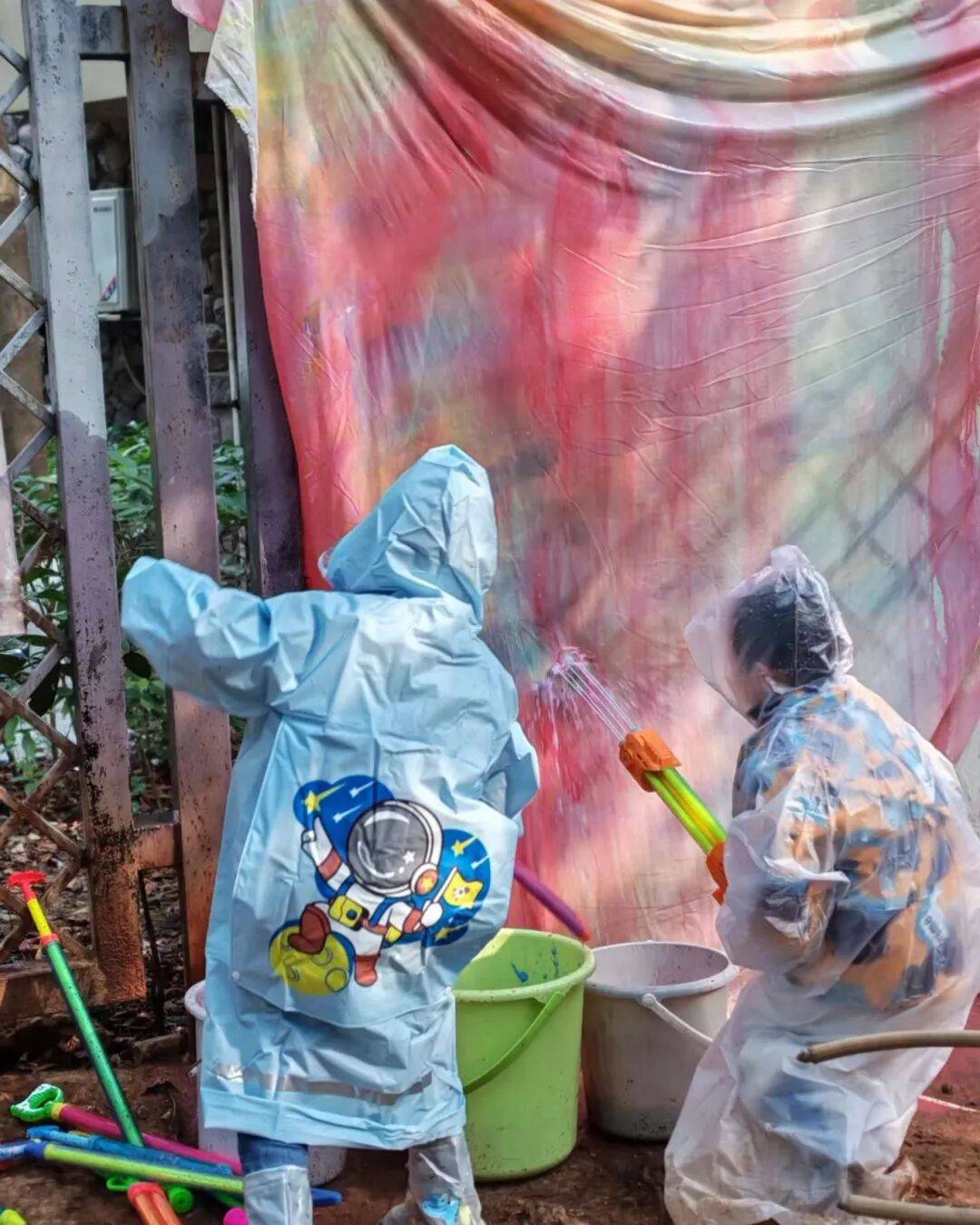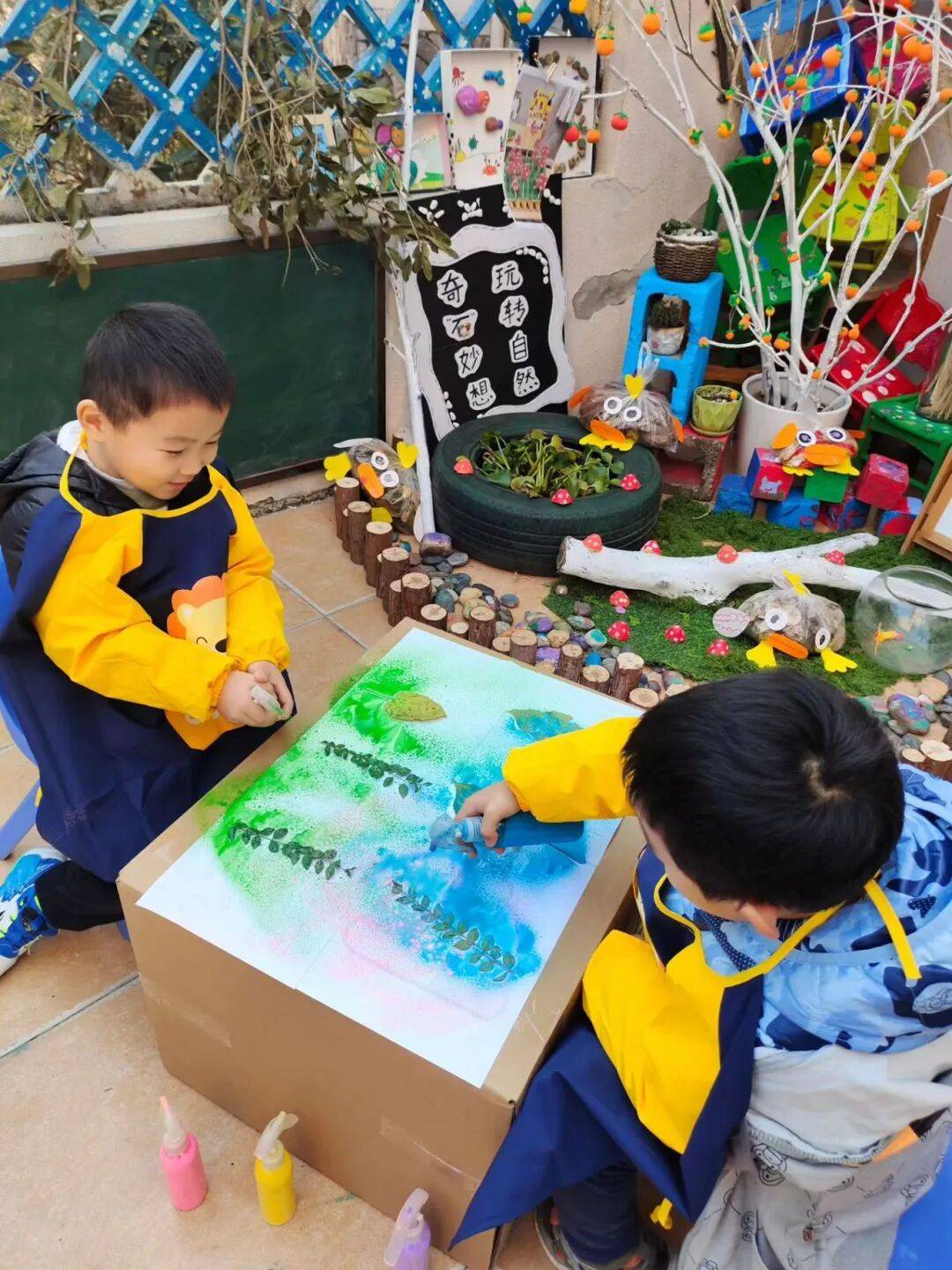 金色梯田幼儿园积极打破区域界限,利用教室、天台、走廊、小树林等空间,为幼儿创设开放、联通的涂鸦环境。同时提供低结构、多样化、贴近自然的涂鸦材料,并跟随幼儿游戏进程动态调整。