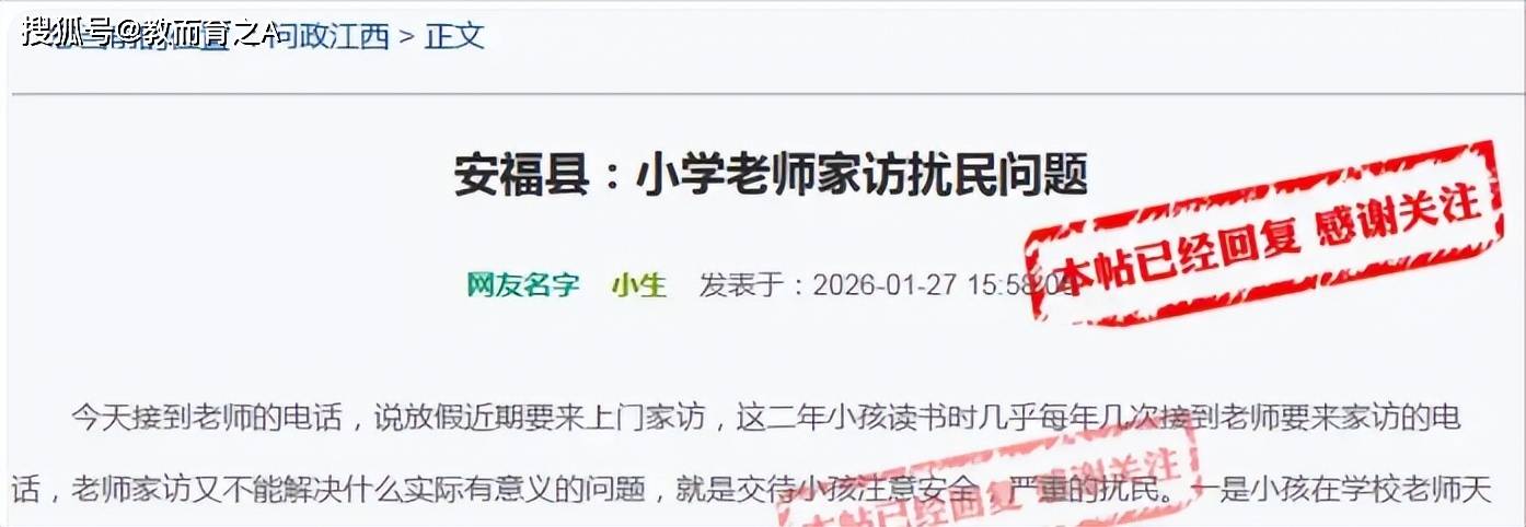 一位家长,在当地的问政平台上对老师进行投诉,称老师每一年寒假都要到学生家里家访,纯属扰民。这位家长投诉称,这几年,家访没少接待,一年能来三四趟,可每次来的内容,几乎一模一样。开场是几句无关痛痒的寒暄,中段永远是“放假期间注意安全”的叮嘱,结尾也离不开“希望家长配合学校工作”的客套。