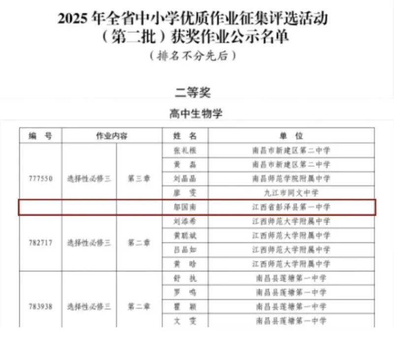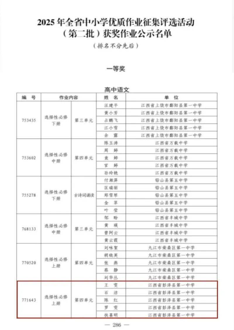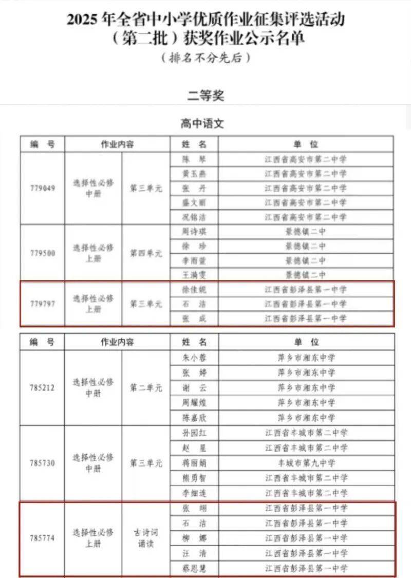 近日,在江西省教育厅办公室组织的中小学优质作业征集评选活动(第二批)获奖名单公示中,彭泽一中再次脱颖而出,斩获多项荣誉。学校高中语文学科荣获一项省级一等奖、两项省级二等奖、一项省级三等奖,高中生物学科荣获省级二等奖,初中英语学科荣获一项省级二等奖、一项省级三等奖,高中地理学科荣获省级三等奖。这份亮眼的成绩单,再次彰显了学校在教育教学改革中的深厚积淀与持续创新能力。
